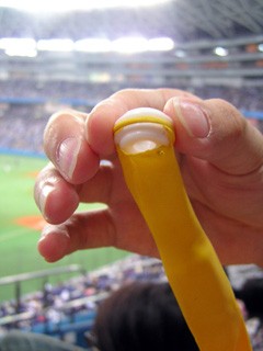 昨年は川アが抜けていた、今年はズレータが抜けているという特殊な事情はありますが、 4番・松中以外は打順が大幅に変わっています。 昨年までは、「MJZ砲」と呼ばれたクリーンアップがホームランを打ちまくって勝っていたという感じでしたが、 今年からは攻守の要・城島がいません。 また、そこそこホームランも打っていたバティスタを解雇し、新人・松田を起用するという思い切った策に。 日本が初代世界一となったWBCでも、王監督が掲げていた「スモール・ベースボール」。 WBCメンバーで言えば、イチローや西岡・川アといった面々が、エンドランやスチールでかき回し、 繋がりのある打線でコツコツ点をとっていき、 少ない得点を硬い中継ぎ投手陣と堅い守備で守りきるという、まさに「日本の野球」。 王監督は、今年のソフトバンクにもこの「スモール・ベースボール」の展開を理想としていたようです。 しかしやはり城島の穴は大きく、キャッチャーのリードや盗塁阻止の面でも難があり、 さらに川アが帰国後ヒジを痛めていたためしばらく欠場するという、ここにもまた大穴が。 でも川アは帰ってきました。これで理想の「野球」に近づくことができるのでしょうか。 この後、私は通路上にあるKFCで昼食を買いに出ました。 ところが、列が途中で止まって動きません。 チキンが売り切れて、下の店から揚がったのを 持ってくるのを待っていたがため。 この間にアナウンスが。 「只今より国歌の独唱を行います 選手・コーチ・スタンドの皆さんは、センターの国旗にご注目ください 本日担当してくださるのは、吉幾三さんです!」 おいおいおいおいおい!!! 早く持って来いやゴルァ(゚д゚)!! このチキン野郎!!!(意味違う) なんかバファローズにメッセージも言っておられました。しかし見られず。あぁ、儚い。 それどころか。まだ並んでいる最中なのに、 「1回の表、ホークスの攻撃は、 1番、Center Fielder, Naoyuki Ohmura! No.1!」 スタンドからあのトランペットの音が聞こえてきた。 ♪鍛え上げられた その足で 踏み出せ核弾頭〜 わーーーーーーっ!! ♪らーらーららーら ♪らーらーららーら ♪らーらーららーら らーらーら ♪らーらーららーら ♪らーらーららーら ♪らーらーららーらーらー (ホークスの3・3・7拍子のBGM「線路は続くよどこまでも」の一節) おいおいおいおいおい!!! 早く持って来いやゴルァ(゚д゚)!!(再) 「2番、Short stop, Munenori Kawasaki! No.52!」 やっとこのあたりで順番が周ってきた。 慌てて近くの通路からスタンドへ。 なんとか信彦・柴原の連続タイムリーは見ることが出来ました。 しかしこの間にね、カブレラの狭殺逃れとか面白いものがあったみたいで… あぁ、儚い。 例によって今回も割と投手戦。 試合が動いたのが3回裏、打席には迎。 ![]() かきーーーーーーーーん!! レフトポール際に飛び込むソロホームラン。 正直、このときの率直な感想。 「誰に打たれとんねん、杉内よぉ!」 あぁ、儚い。 ![]() その後、なんやかんやで、中村まで打席が回ってきます。 しかしこの時点で打率1割6分台(注:4番打者)。 あぁ、儚い。 日本に帰ってきた今年から、新しい応援歌が使われています。 ところが、この打席では、 ♪我らの期待を そのバットに乗せて ミラクルアーチを 決めろ紀洋〜 かっとばせー、のーりひろ、 ソフトバンク倒せー、オゥ! なんと近鉄時代の応援歌&掛け声採用。 これは何の意味があったのかな… 5回にもソフトバンクはさらに1点を加えます。 …が、6回裏のこと。 ![]() 打率.163の儚い4番打者、 中村紀洋にソロホームランが。 あぁ、儚い杉内、儚いノリのソロ。 さて、6回裏ですから、風船飛ばしの準備を始めます。 去年買った風船が2本余ってたので、それを持ってきました。 2アウトになるまでは膨らませない主義の私。 それまでは風船を良く伸ばして、膨らみやすいようにしておきます。 ぎゅー… ぎゅー… ビリッ!!! ![]() おいおい、これじゃ膨らませられないよ! 「ゴムは破れちゃ使い物にならない」とかいうネタ発言はおいといて、 もう1本の風船を用意。それを良く伸ばして膨らませる準備をします。 そしていよいよ2アウト。 一気に風船に空気を入れ始めます。 ぷー… ぴゅーー… ボカン!!!!! ![]() 前にいた観客の方、耳元ででかい音、すいませんでした… 緊急事態、風船がなくなった!! 慌てて予め用意していたオリックス用ジェット風船を用意。 それも使う機会が少なそうな「勝利時用赤風船」を利用。 黄色い風船が飛び交う中に、 明らかに目立つ赤い風船がドームの中を飛び回っていった… あぁ、儚い。 7回表。先頭の松田が内野安打で出塁、続く山崎がバント成功。 ここでピッチャーが菊地原にスイッチ。 でも止まらない打線。 大村がタイムリー、川アが内野安打、 さらにカブレラのツーベースでもう1点。 信彦敬遠の後、柴原に変えて打席には井手正太郎。 ここでピッチャーが萩原に代わります。 ストレートのフォアボールでさらに1点。 チャンスは続いてまし