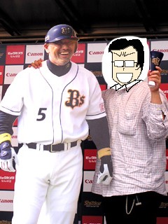 ![]() ヒーローインタビューは、猛打賞の いつものような「魔の9回症候群」は無かったにしろ、 結構緊張感のある試合でした。 ソフトバンクも、去年みたいに主軸のホームランで点数を荒稼ぎするという打線ではなくなり、 山崎が結構多くやったバントのように、1点をコツコツとって行く打線に変わりました。 前回「調子がよくなったかも?」と言ったオリックスは、 あの後再び調子を落としてしまいました。 この文章を書いている4月27日現在、清原は一端復帰しながらも、 再び足を痛めてスタメンから外れると言う日々が続いています。 今度の試合では絶対清原を見たい。全力で彼を応援したい。それが私の願いです。 …ホームランと言えば。 過去3試合、私が大阪ドームでダイエー→ソフトバンクを応援した試合では、 どの試合でも松中信彦様がホームランを打っていたのです。 今日も少し期待しました。 しかし結果は、タイムリーはあったものの、ホームランは出ず。 ここに、「私が見れば信彦がHRを打つ」というジンクスが崩壊しました。 あぁ、儚い… で、ドームと地下鉄大阪ドーム前千代崎駅との間に止まっていた車に、 清原の等身大(?)パネルが置いてあって、並んで撮影ができるようになっていた。 えい。(さすがに顔を出すのはマズいんで、顔部分はイラストで代用してます) ![]() (撮影:今回同行した友人の片方) か、勘違いしないでよねっ! 後の二人にノセられたからやってるんであって、 別に自分からやろうと思った わけじゃないんだからっっっ!! こんなネタで満足してる自分が、いちばん儚い…orz ここで、最後に、再び豊田元浩さんから言いたいことがあるそうです。 ・・・・・・ ・・・・・・・・・・・・ いつかまた来てあげるんだからねっ! そん時には手足治してなさいよっ、 バカーーーっ!!! ・・・また言ってみたかっただけですorz ![]() オマケ:打席に向かう時、「ガッチャマン」のテーマをかけることでおなじみ、奇跡を呼び込む男・北川博敏 |