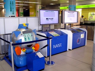 駅の前には、NAISTが開発した情報端末と、駅のシンボルキャラクター「キタちゃん」をモチーフにした案内ロボットが設置されています。 |