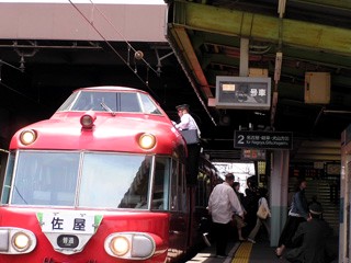 何にビックリしたかって、「中部国際空港」の英語表記のトコ。「Int'l」ってInternationalの略語(Intl.と表記することもあるようです)があるってことに、この時期になってやっと知ったんだよ。鉄道雑誌でこのセントレア行きの列車の話は何度か出ていたはずなのに、まったく気にしていなかった…ちなみにミューチケットの券面にも同じ表記。 ![]() ↑のような感じですねぇ さて新名古屋。西尾行きの快急で神宮前へ行きます。 と、金山を出た辺りで東海道線の方に、キハ75系の区快・武豊行きが出現。 しばらく併走してる…ってか、あっちの方がこっちの方を追い越しにかかってきた感じがして。 …武豊速い!武豊速い!武豊速い!西尾を…今、追い越した〜!! …まさか関西圏だけじゃなくて中京圏でも私鉄<JRの図式が成り立っているとは…(関係ない) 私は私鉄好きですので…(別に判官びいき、というわけではないんだけど。) で神宮前。 名鉄屈指の駅撮り撮影地として有名なこの駅。既に岐阜方面ホームには先客がいました。 しばらく編成写真を撮るのに慣れていなかったので、特に2両編成の普通電車とか失敗しがちで… 4両程度ならいつも見慣れているから、大体タイミングも掴みやすいんですけど、 2両編成って意外と捕らえづらいんですよ、私にとっては。 神宮前の岐阜側には踏切があります。 が、複々線をひっきりなしに電車が行き交う上に、隣接する東海道線も踏切としては続いてます。 文字通り「開かずの踏切」となりうる場所です。多分フツーの自動踏切だったら、開いてる時間無いよ。 でもここは、いまどき踏切番がいて、巧みな操作が繰り広げられていました。 例えば列車が近いときでも、歩行者だけ横断を許すように遮断機を上げ下げしたり、 警報機の音も一般的な「カン、カン、カン…」ではなく、 なんと、遮断機が下がる時だけ「プルル、プルル」って2回ほど鳴らして下げる、というもの。 名鉄名古屋の案内放送も、自動放送では追いつかないという理由で、今も駅員さんが巧みに放送してます。 それと同じような光景が、ここ神宮前でも繰り広げられていました。 で、私も含め、今回の「先客」たちの目当ては、ほぼ確実に↓です。 ![]() もともとミュースカイは3両編成でデビューしました。 しかし予想以上の好調に、輸送力が追いつかないこともあり、 万博の時期には、スピードが劣る1600系や1000系で代走していたこともあったようです。 今回、4月改正にあわせ、名鉄さんは輸送力増強としてミュースカイを順次4連化することを発表しました。 この4連化は、既存の3両編成に中間車を1両加えるパターンと、 4連の新車を最初から導入するという2パターンがあります。 さらに、このGWは、空港特急も混雑を見込んで、3連単独・4連単独・3連+3連の6連とともに、 今回は3連+4連の7連で運転するという、期間限定の新しい編成が走るわけです。 上の写真をよく見て頂けたら分かるとおり、正面左側の窓に「7」と書かれたカードがあるのがわかります? これがその7連ミュースカイ。多分今回のゴールデンウィークが最初で最後の運転となるでしょう。 ![]() ![]() ところで、左の写真がミュースカイをはじめ、新たに導入された一部特別車編成2200系など、 最近導入された新型車両に使われている新しい方式の行先表示です。 右の写真(1200系)の幕式表示とは様子が違うのが分かるでしょ? これは名鉄が今回新しく導入した、LCD式の行先表示なんですって。 つまり液晶モニターに近い形で行き先表示を使っているそうです。 もともと名鉄は行先も多岐に渡る上、途中駅での種別変更も多いので、幕式だと不利な点が多いそうです。 かといって、今流行のフルカラーLEDを使おうにも、晴天下では視認性に問題も。 カメラで写すとほぼ確実に黒い線が入っちゃう。 その点、この新式なら、バックライトが必要という欠点はあるものの、従来の幕式表示と同じ程度の視認性が得られるということなんだとか。 ちなみに、よく見たら、1000系もこの新しい方式を採用していましたよ。 1000系は昔、確か種別・行先一体型の行先表示を採用していたはずなので、取り替えたんですね。 一部特別車1200系を連結した編成も、1200系は幕なのに、1000系はLCD。 あれを見たときは妙な感じがした… ついでに、西尾行き特急と聞いて、1600系を期待したのに、来たのは1000系だった…絶望した。 だから今回1600系の編成写真はありません。 さてここ神宮前では乗務員交代が行われます。昔からの名残なんでしょうか。 その際、パノラマカーが来ると、面白い光景を目にできます。 ![]() ↑これ。 車両横にハシゴみたいな凹みがあって、そこに手足をかけて運転手さんが上り下りして交代します。 この新鮮な光景も、新3300系の投入が続けば、見られなくなってしまうんでしょうか… 一通り撮影を終えて、一部特別車の「特急」で中部国際空港へ向かいます。 ![]() オマケ:15年前に一度消えて復活した「準急」。パノラマカーにとっては久々の